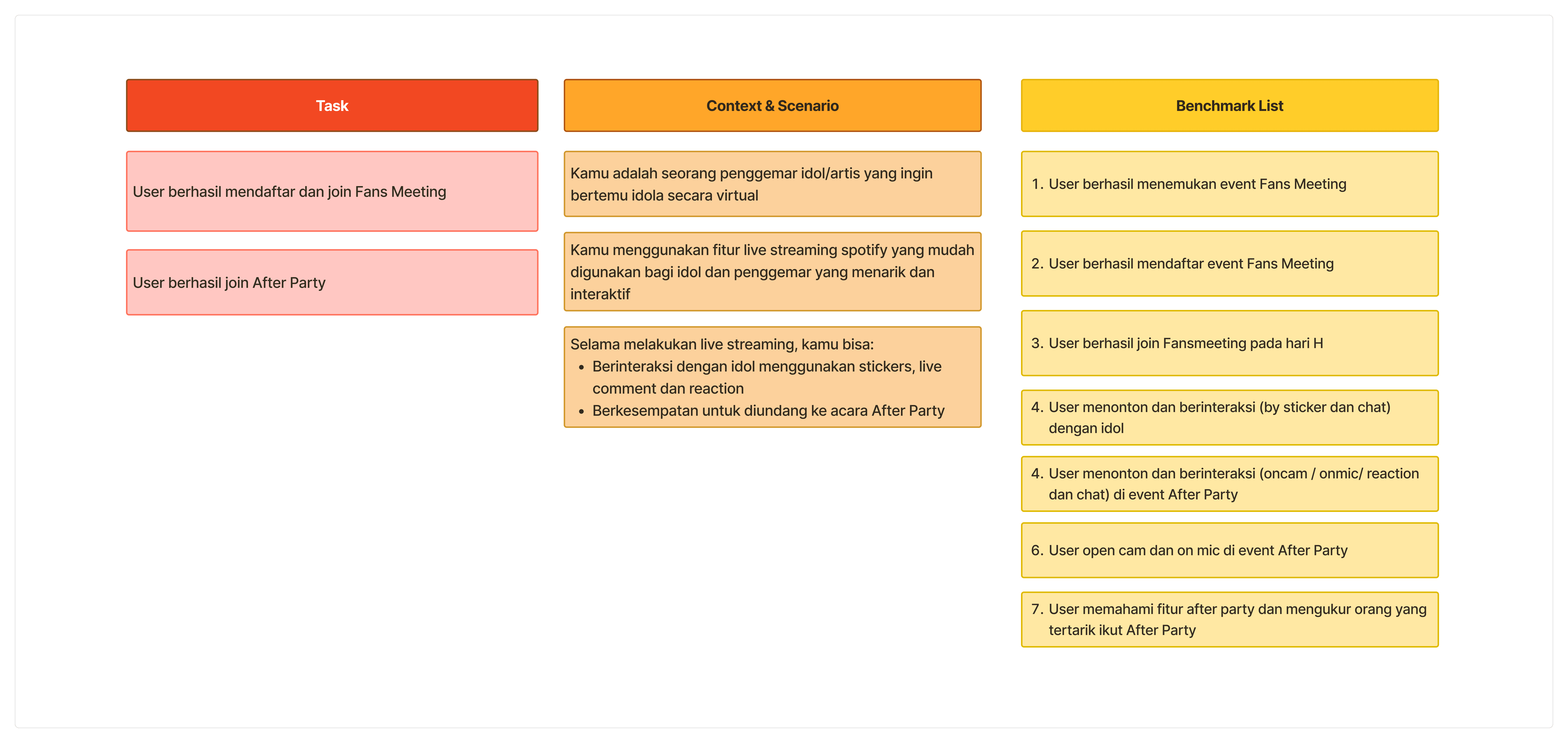 Lebih dari 70% pengguna spotify menunjukan minat untuk berinteraksi langusng dengan artis favorite mereka. Hal ini membuat spotify ingin meluncurkan fitur baru yaitu "Fans meeting" untuk memanfaatkan peningkatan keterlibatan pengguna dan memperkaya pengalaman musik mereka. Hal ini juga didasarkan dari 40% penggemar musik lebih memilih pengalaman virtual dibandingkan acara tatap muka langsung. Harapannya proyek ini menarik 50.000 partisipan dalam 3 bulan pertama peluncuran dan meningkatkan keterlibatan 30% dari seluruh pengguna spotify. Proyek ini juga diharapkan dapat mendorong pertumbuhan aktif pengguna Spotify sebesar 20%