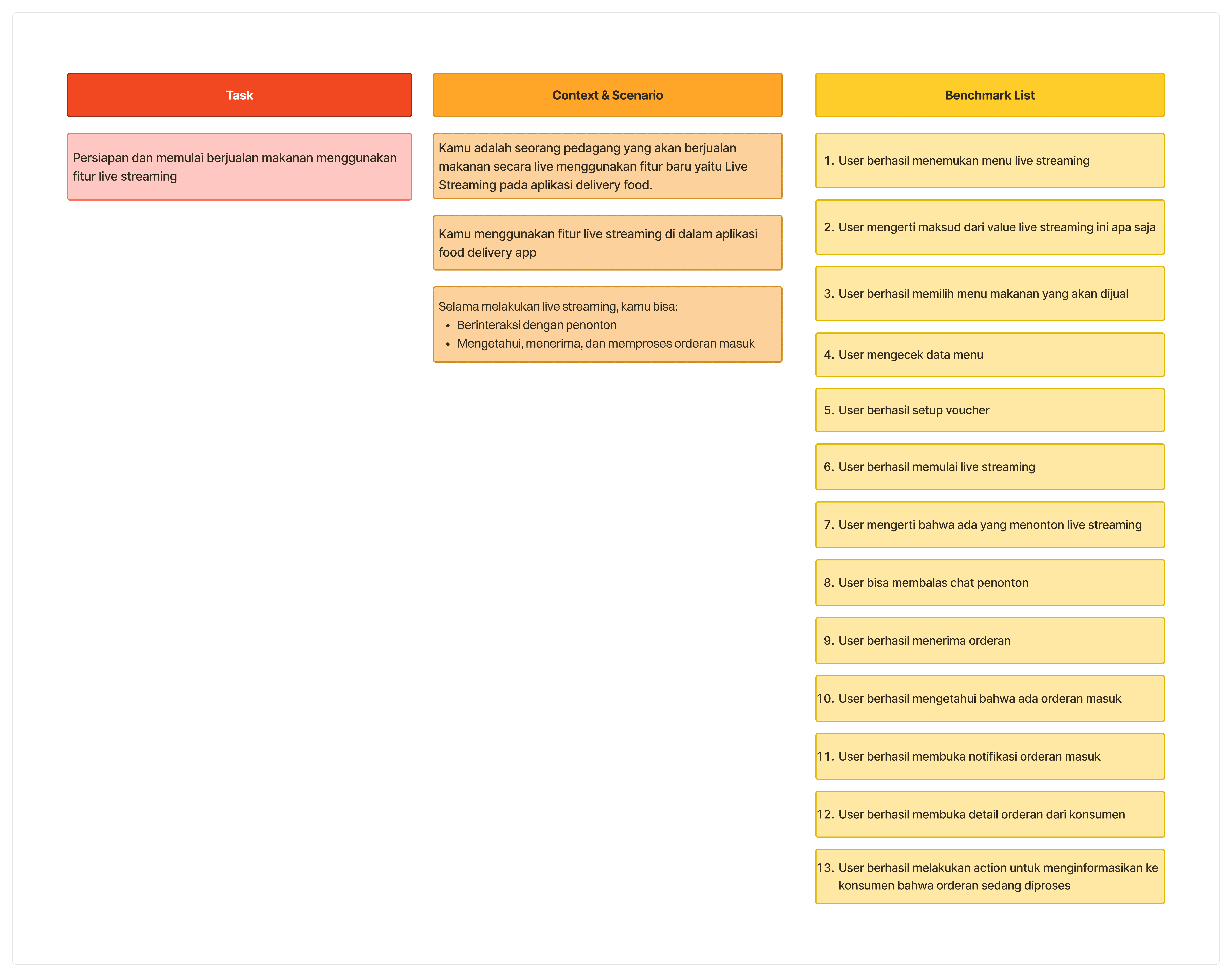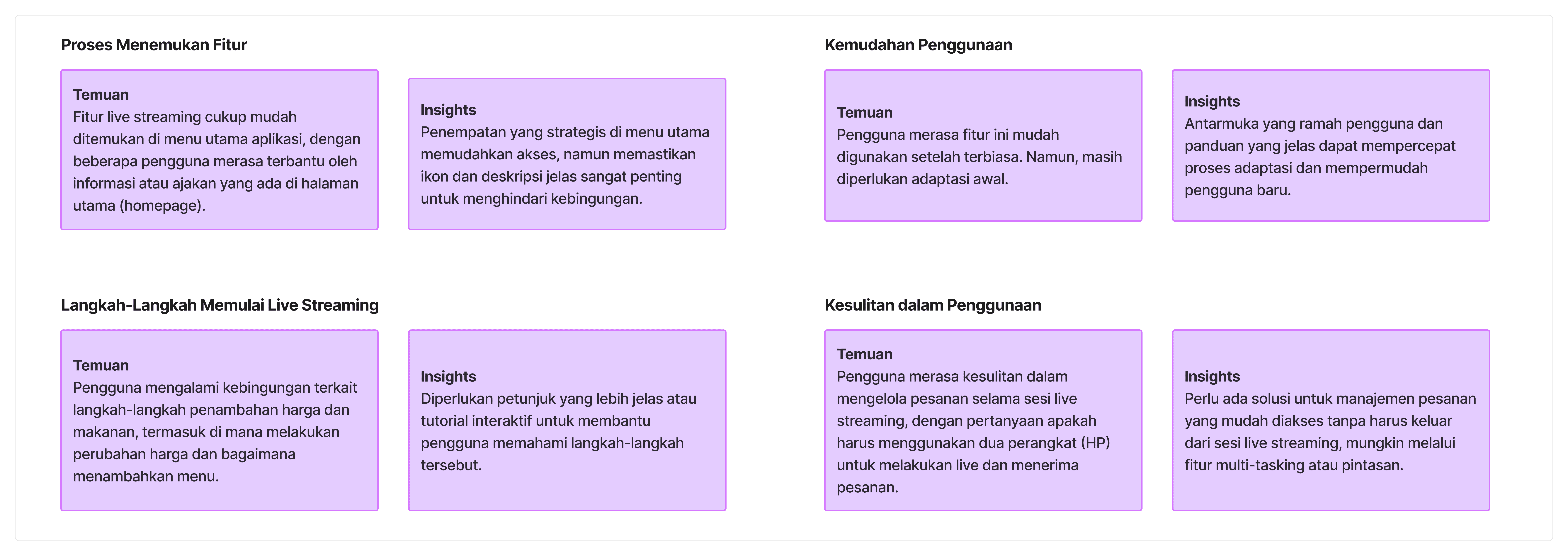 🔥 Kesimpulan: Fitur live streaming umumnya mudah ditemukan dan digunakan, namun ada kebutuhan untuk edukasi lebih lanjut mengenai penggunaannya, terutama terkait penambahan menu dan manajemen pesanan selama sesi live streaming.