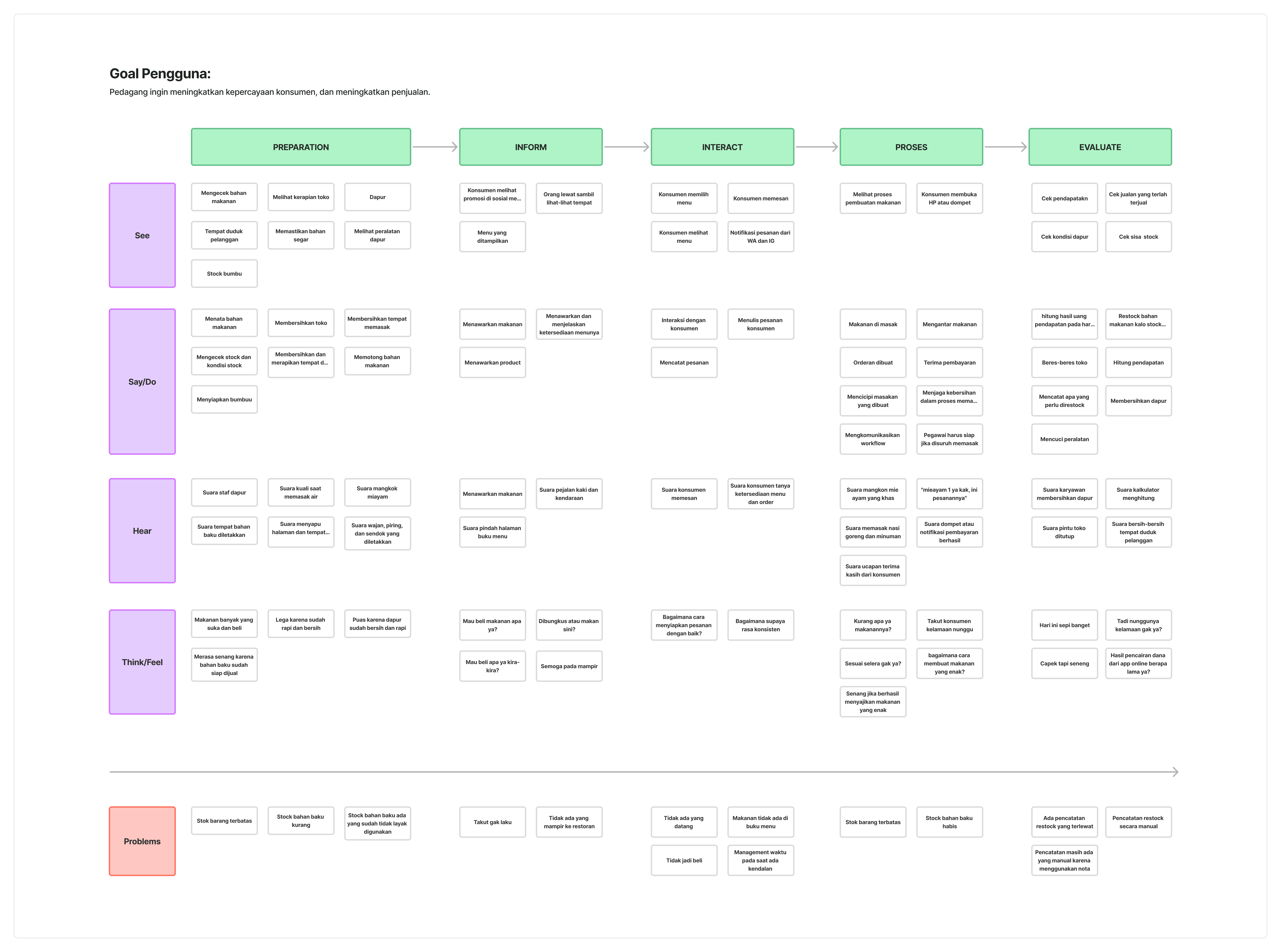 Melakukan research serta memahami behaviour dan mental model pengguna, memetakan mental model dan masalah pengguna, membuat growth strategy, menyusun information architecture, merancang solusi dan prototype, dan melakukan usability testing.